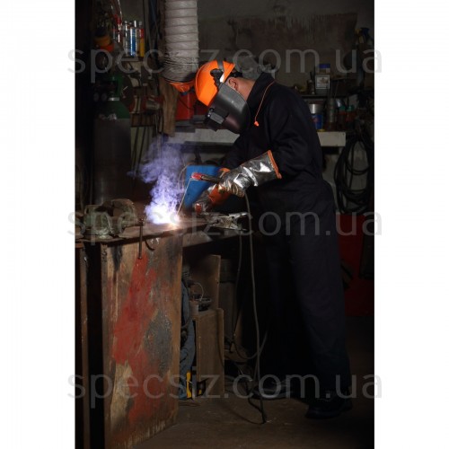 Шкіра воловий спілок на долоні з антитермічною обробкою (THT). Тилова сторона алюмінізована Kevlar Preox® Підкладка вовняна. Зшито нитками за кевларовою технологією Kevlar® Американська форма. Манжет 20 см. Довжина: 40 см.