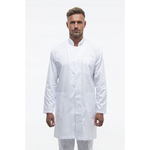 Халат медичний чоловічий прямого силуету. Довжина середня. Комірець-стійка. Застібка супатна (потаємна) на кнопках, з внутрішньої сторони декорована принтованою тканиною. Є бічні розрізи під кишені брюк. Можливий варіант з однотонною внутрішньою обшивкою. Рукав довгий. Тканина: голландський котон, медична бавовна преміум якості (Нідерланди). Склад: 65% поліестер, 35% бавовна. Щільність: 164 г / м2. Фурнітура: Німеччина. Кольори: білий. Розміри: 42 – 60.